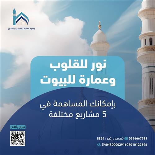 ”بنور الأيمان.. تُضيء بيتاً من بيوت الله“ ساهم في مشاريع متنوعة تندرج ضمن عمارة المساجد، بمبلغ يسير وأجر عظيم: 1-مشروع بناء المساجد 2-مشروع ترميم وصيانة المساجد 3-مشروع تأمين احتياجات المساجد 4-مشروع نظافة المساجد 5- مشروع سقيا الماء