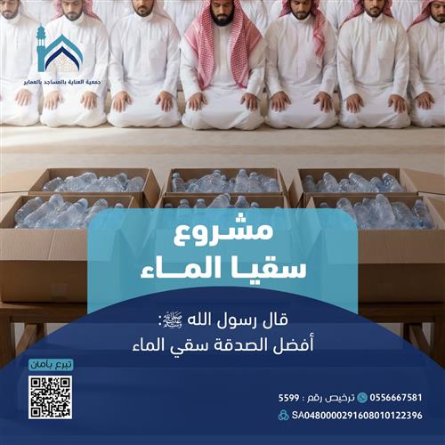 ”اسقِ مصليٍاً .. سقاك الله من كوثر نبيه“ يهدف المشروع إلى توفير عدد من كراتين المياه في المساجد، تبرع بالقيام في خدمة المصلين وتوفير سقيا الماء لهم؛ لتساهم في أعظم الصدقات قال الرسول ﷺ (أفضل الصدقة سقي الماء). ساهم معنا لتوفّر الماء البارد للمصلين في بيوت الله، وكن سبباً في راحتهم. سقيا الماء من أحب الصدقات إلى الله، وخيرها ما كان في المساجد .