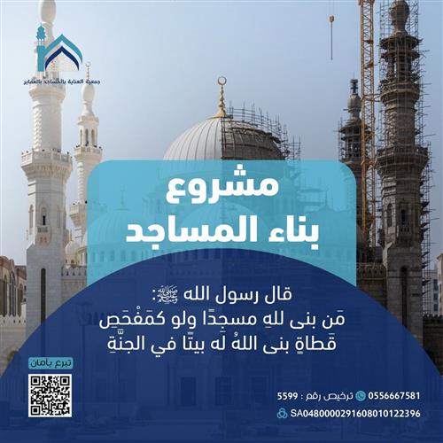 ”ابن لك بيتاً في الجنة.. ببناء مسجد على الأرض“ قال رسول الله -ﷺ-: "من بنى لله مسجداً ولو كمفحص قطاة بنى الله له بيتاً في الجنة". اغتنم هذه الفرصة لتترك أثراً أبدياً, فالمسجد صدقة جارية, وثوابها لا ينقطع.